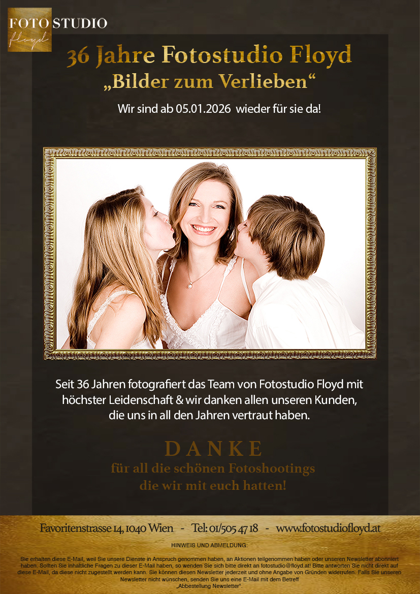 Du kannst deine erteilte Einwilligung jederzeit mit Wirkung für die Zukunft unter fotostudio@floyd.at widerrufen. Im Falle des Widerrufs werden deine Daten umgehend gelöscht. Deine Daten werden ansonsten gelöscht, wenn wir deine Anfrage bearbeitet haben, es zu keiner Geschäftsbeziehung kommt oder der Zweck der Speicherung entfallen ist. Du kannt dich jederzeit über die zu deiner Person gespeicherten Daten informieren. Weitere Informationen zum Datenschutz findest du auch in der Datenschutzinformationen dieser Webseite.